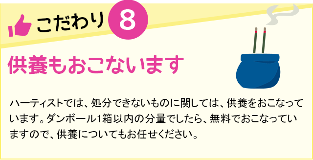 ハーティストでは“不用品回収”という考えは持っていません。ご遺品一つひとつを丁寧に取り扱い、買い取れるものやリサイクルできるものをきちんと判断いたします。簡単に捨てられないものは供養もさせていただきます。