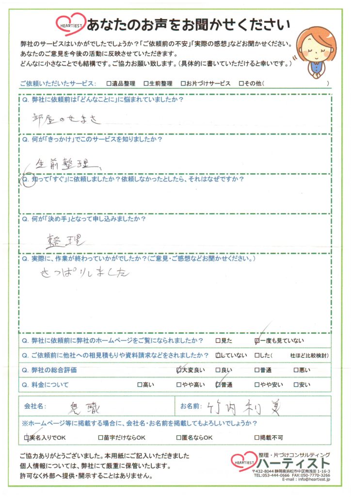 浜松市東区の高齢者施設へ入居されている竹内様より施設内個室の片付け・整理の依頼をいただきました。